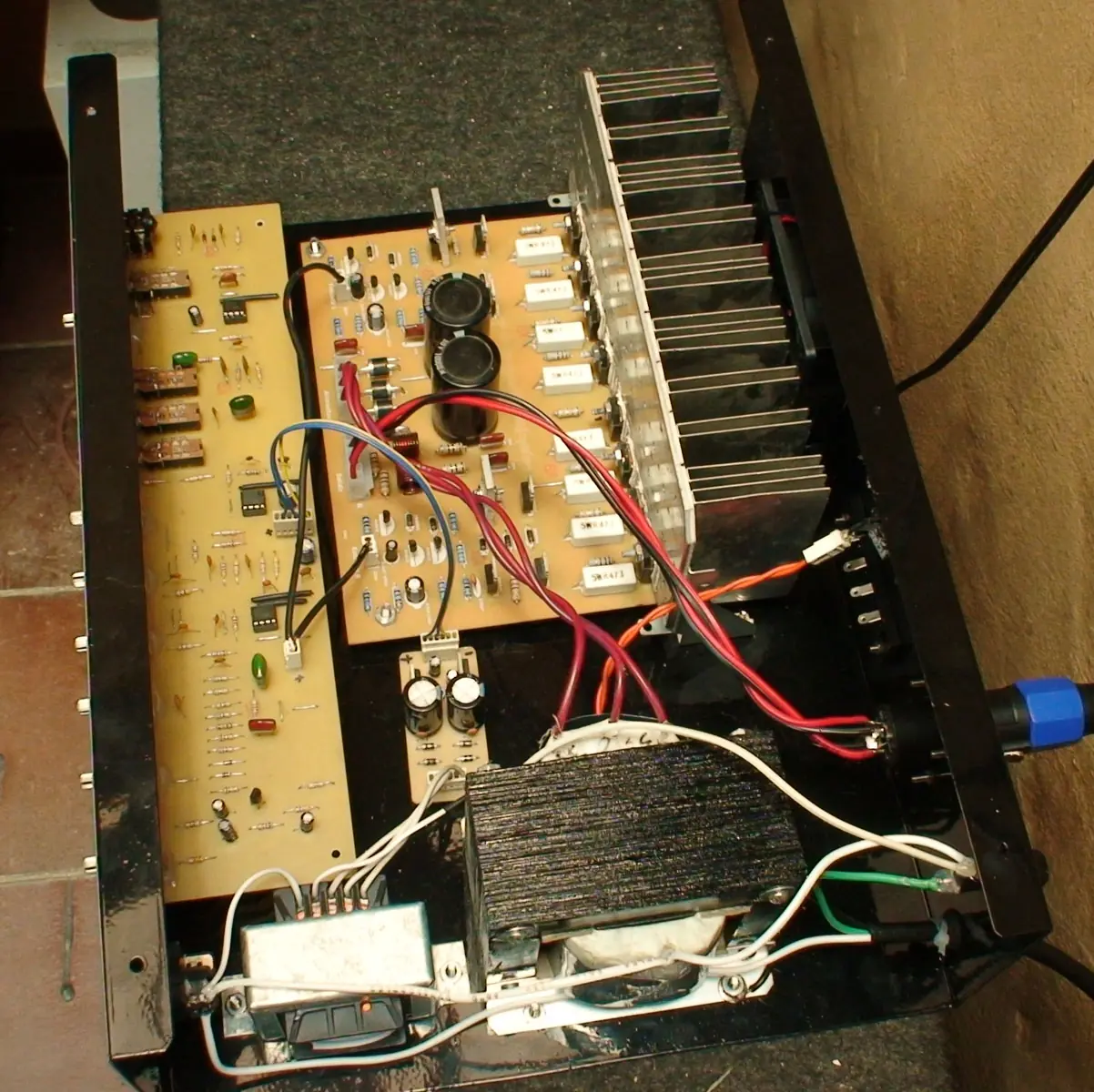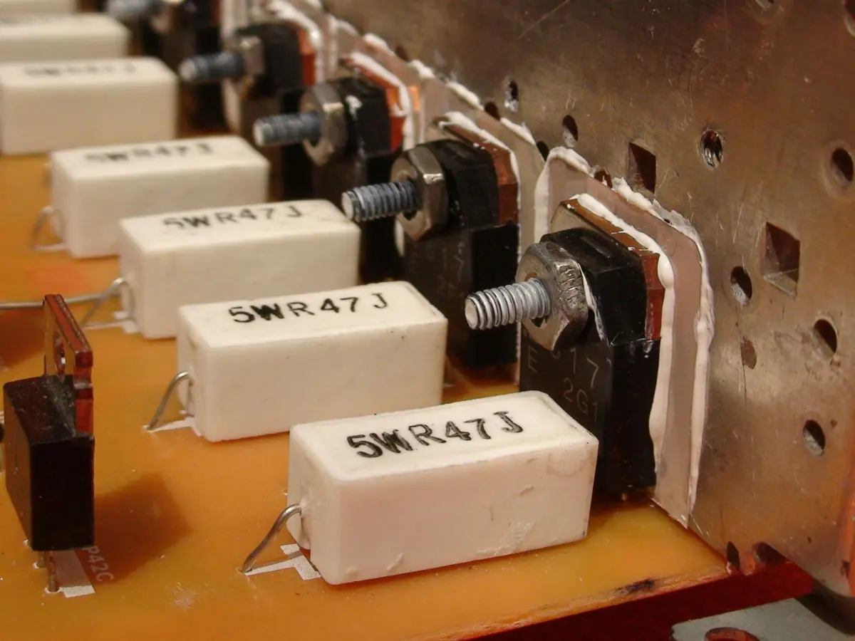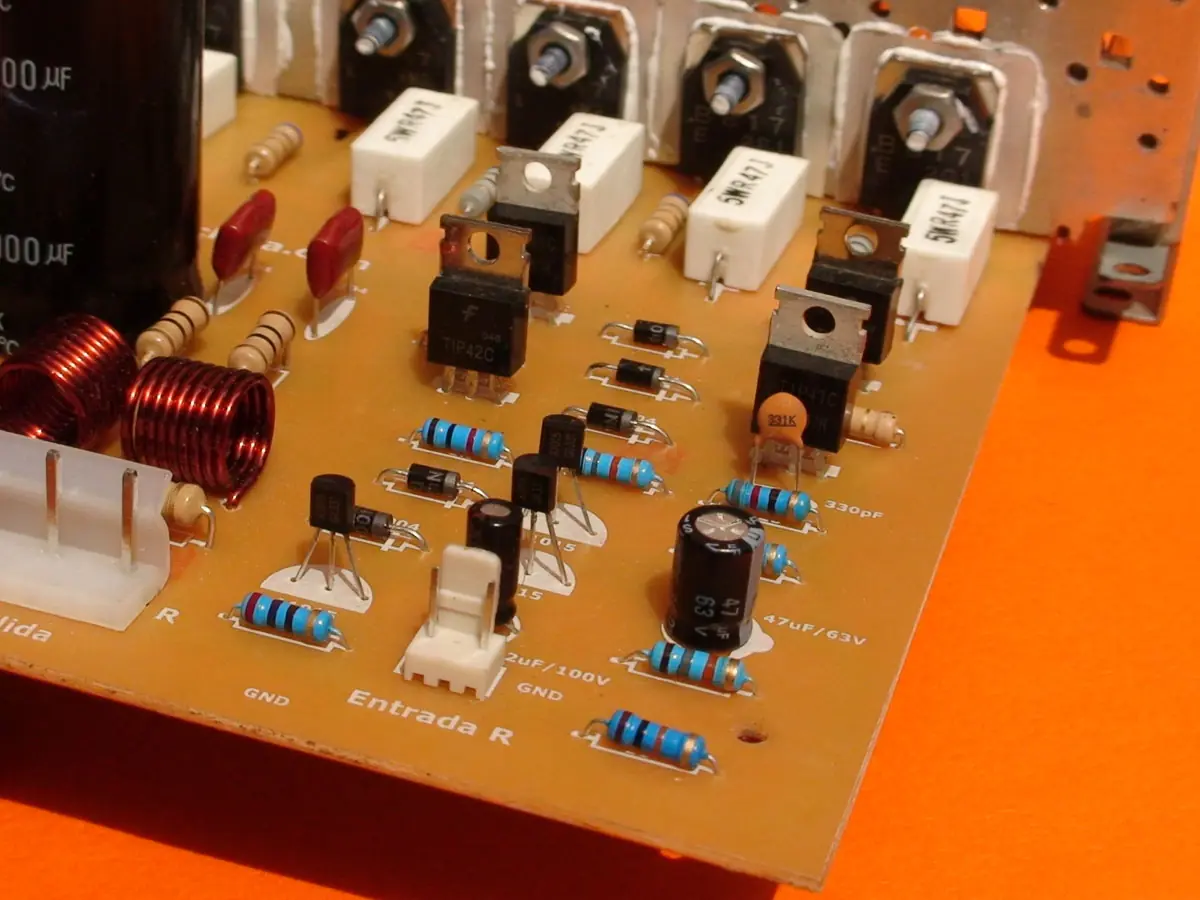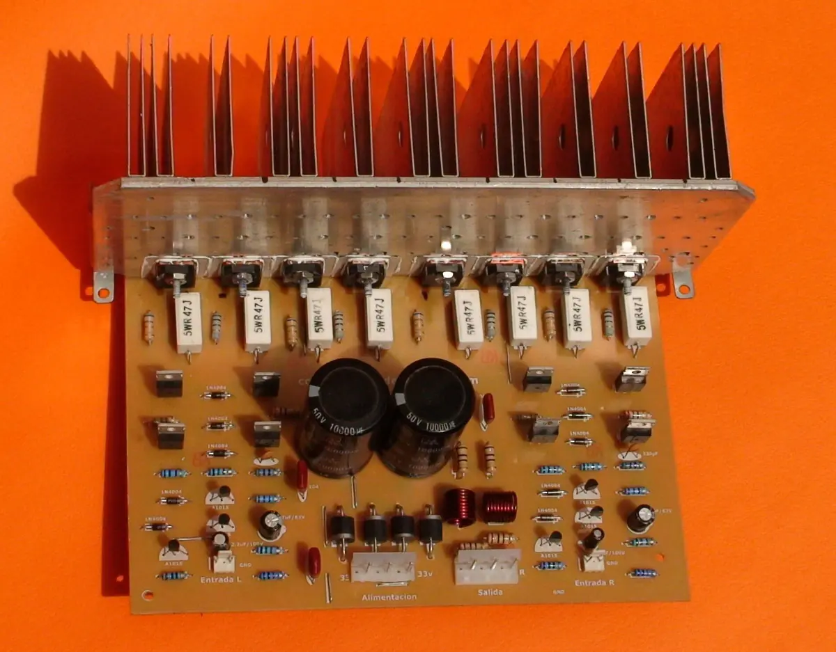 Recuerde que los transistores de salida van aislados del disipador con aislantes de mica y grasa siliconada la cual ayuda a trasnsmitir el calor al aluminio.