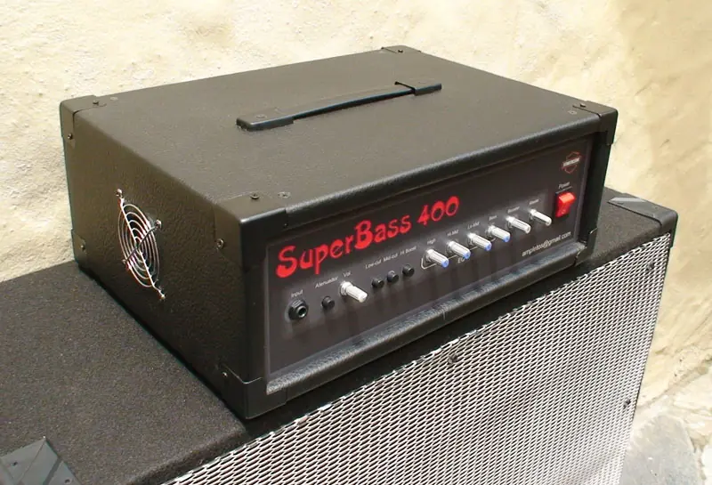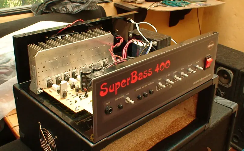 En los laterales le pusimos unas mallas que recubren unos orificios de ventilación por donde sale el aire que un ventilador en la parte trasera introduce al amplificador para asi mantenerlo en buena temperatura.