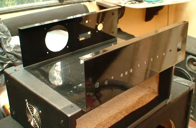 Podemos observar la lámina metálica que se uso para la caja de este amplificador, la cual fue hecha en lámina ordinaria y pintada con pintura electrostática, la cual es de muy buena calidad. Tenga en cuanta que antes de pintar hay que hacer las perforaciones necesarias para los potenciómetros de preamplificador, Botón de encendido, fusible, salidas y ventilador.