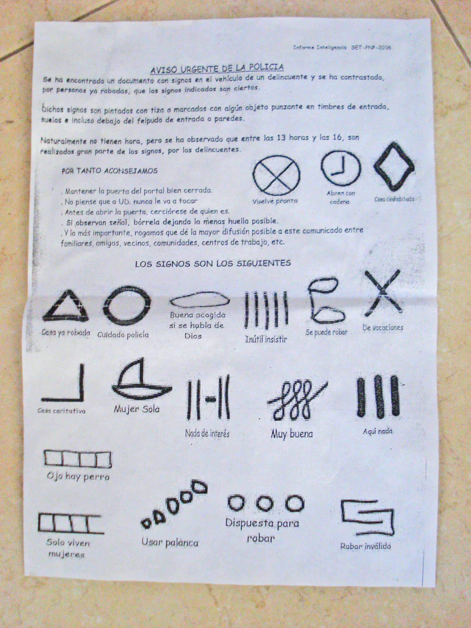 A través de un informe, la Policía publicó los signos con los que ladrones pintan los frentes de las casas o dejan mensajes debajo de felpudos para identificar, por ejemplo, dónde viven mujeres solas.La Policía encontró un documento en el vehículo de un delincuente con signos que fueron contrastados por personas asaltadas.