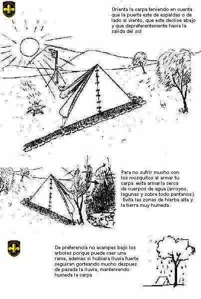 La carpa debe estar orientada de acuerdo al sol, al viento y la pendiente. De preferencia debe estar orientada hacia el lugar por donde sale el sol de mañana, así podrá calentar la carpa rápidamente y ayudar a dispersar los "humores" de 8 personas durmiendo juntas. Pero siempre la carpa debe estar de lado o mejor aún, contra el viento evitando que sople directamente por la puerta, incomodando, arrastrando polvo y hasta lluvia. Recuerda: NUNCA ARMES UNA CARPA DE FRENTE AL VIENTO. En cuanto a la pendiente, lo mejor es que la puerta este mirando "cuesta abajo", en fin en el balance de las tres condiciones esta es la menos importante y el factor viento esla mas decisiva.