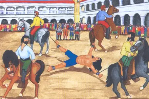 Se le sacó a media plaza: allí le cortó la lengua el verdugo, y despojado de los grillos y esposas, lo pusieron en el suelo: atáronle a las manos y pies cuatro lazos, y asido éstos a la cincha de cuatro caballos, tiraban cuatro mestizos a cuatro distintas partes: espectáculo que jamas se había visto en esta ciudad. No sé si porque los caballos ni fuesen muy fuertes, o el indio en realidad fuese de fierro, no puedieron absolutamente dividirlo, despues de un largo rato lo tuvieron tironeando, de modo que le tenían en el aire, en un estado que parecía una araña.