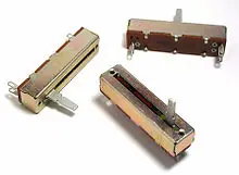 -Potenciómetros deslizantes: La pista es recta, de modo que el recorrido del cursor también lo es. Se usa, sobre todo, en ecualizadores gráficos, pues la posición de sus cursores representa la respuesta del ecualizador. Son más frágiles que los rotatorios y ocupan más espacio. Además suelen ser más sensibles al polvo.