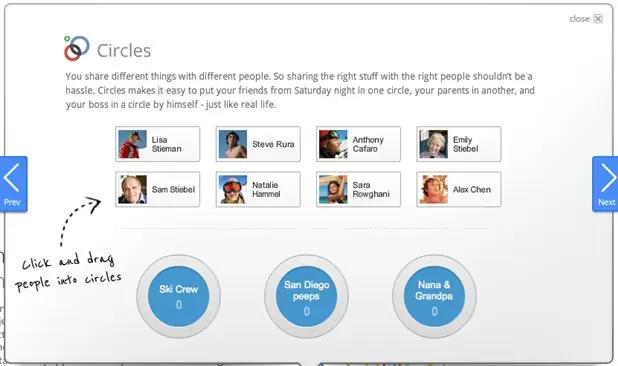 Basada en la existencia de diferentes tipos de relaciones con las personas que integran nuestro círculo social, la red de Google, cuyo nombre se pronuncia Google Plus, introduce los denominados +Circles, o círculos en torno a los que agrupar a las personas en función del tipo de relaciones que mantenemos con ellos. De esta forma la compañía quiere facilitar a los usuarios el tipo de interacción deseado con cada grupo de amigos: familiares, antiguos compañeros, conocidos o colegas de trabajo.