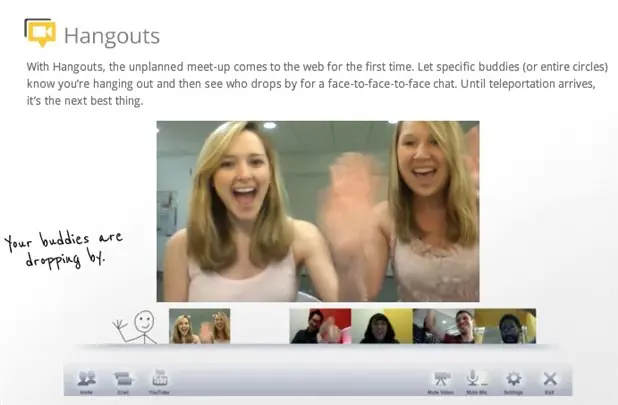 El proyecto de red social Google+ también contempla la posibilidad de establecer videollamadas entre múltiples usuarios que están disponibles en un momento determinado. Bajo la denominación de Hangout, esta característica se basa en la disponibilidad de los integrantes de un círculo para dedicar un rato a un videochat sin que éste haya sido planeado previamente. Los diferentes usuarios pueden unirse en cualquier momento, y la pantalla mostrará en el centro a aquel que esté hablando en cada momento.