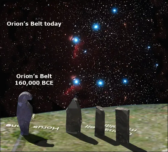 La Tierra se bambolea sobre su eje y así las estrellas y las constelaciones cambia su ángulo de la presentación en el cielo de la noche de manera cíclica. Esta rotación, se denomina precesión y completa un ciclo aproximadamente cada 26.000 años. Al determinar cuando las tres estrellas del cinturón de Orión se coloca plana (horizontal) en el horizonte, podemos estimar el momento en que las tres piedras en el calendario son visibles en la alineación de estas estrellas .
