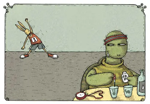 Una tortuga y una liebre siempre discutían sobre quién era más rápida. Para dirimir el argumento, decidieron correr una carrera. Eligieron una ruta y comenzaron la competencia. La liebre arrancó a toda velocidad y corrió enérgicamente durante algún tiempo. Luego, al ver que llevaba mucha ventaja, decidió sentarse bajo un árbol para descansar un rato, recuperar fuerzas y luego continuar su marcha. Pero pronto se durmió. La tortuga, que andaba con paso lento, la alcanzó, la superó y terminó primera, declarándose vencedora indiscutible.