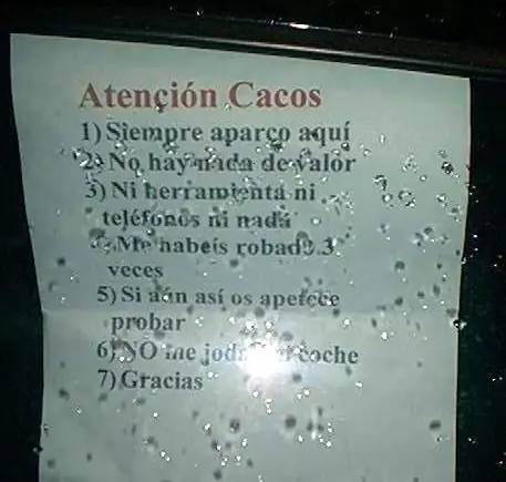 El dueño del coche, harto de que le roben, le deja una nota explicativa a los ladrones.