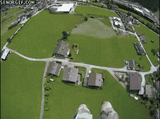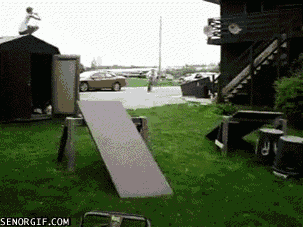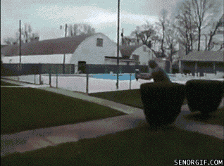 Llegado el momento el tipo espera calculando el tiempo, velocidad y todo pero le sale todo mal, intentando saltar desde el techo espera demasiado para hacer el salto y lo único que podemos decir ante lo que sucede luego es que este hombre no podrá sentarse con comodidad al menos por un mes.