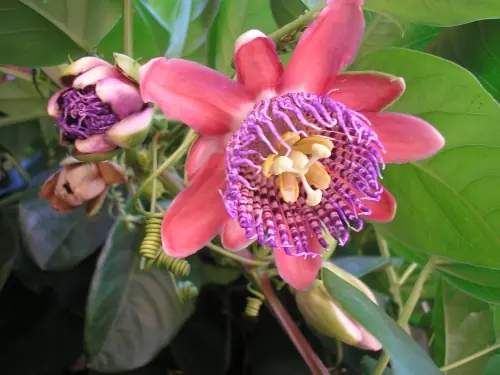 Existen hasta 400 especies del género de las passifloráceas. Son lianas trepadoras que llegan hasta los 9 m. de altura, con los tallos leñosos y la raíz perenne. Sus flores, de unos 5 cm. de diámetro, desprenden una aroma agradable y varían desde colores como el blanco hasta el rosa, pasando por el lavanda pálido o malva. La corona está formada por pétalos rodeados de un círculo triple compuesto por finos filamentos. Todo el conjunto le da a la planta un aspecto muy característico.