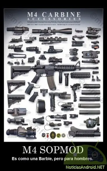 Las mujeres pueden jugar con las Barbies, que traen muchos accesorios para no limitarse. Los hombre jugamos con el rifle M4, que también trae accesorios