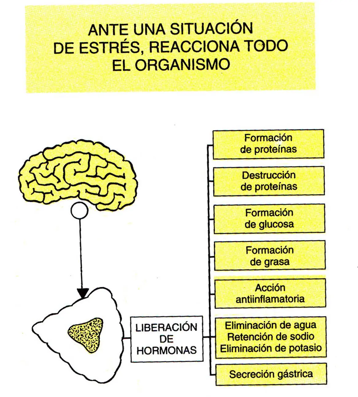 Un lugar donde las hormonas de estrés son particularmente perjudiciales es el cerebro. Se ha encontrado que los niveles elevados de cortisol pueden causar daños en una región del cerebro conocida como el hipocampo que juega un importante papel en la memoria. Un área del hipocampo que muestra daños es la conocida como el giro dentato, esta es una región que produce nuevas neuronas aún en las personas de edad avanzada. Los altos niveles de cortisol también dañan la parte de las neuronas dedicadas a recibir señales en el hipocampo. Se ha documentado una pérdida de hasta 14 por ciento en el volumen del hipocampo en personas de edad avanzada que han estado expuestas a niveles elevados durante largo tiempo. El estrés crónico va poco a poco destruyendo la capacidad para formar lo que se conoce como memoria episódica, es decir los recuerdos acerca de actividades recientes significativas para la persona, como por ejemplo, que desayunó hoy o adonde fue ayer. Por otra parte el estrés parece tener un impacto contrario en una región del cerebro adyacente al hipotálamo llamada la amígdala. Esta región está involucrada en las respuestas de miedo, coraje y agresión. Investigaciones recientes Bajo condiciones de estrés crónico la amígdala desarrolla nuevas neuronas y esto va acompañado de un aumento en los niveles de ansiedad. Se ha encontrado que las personas con depresión o estrés posttraumático tienden a tener un sistema de estrés sobreactivo. Esto puede afectar el funcionamiento de la serotonina, un neurotransmisor que afecta los estados de ánimo y que guarda relación con la depresión. Otros estudios indican que las personas con depresión extrema o condesorden posttraumático tienen un hipócampo más pequeño y experimentan problemas de memoria. Sin embargo, no está claro si el estrés es el causante de estos cambios o si las personas nacen con estas diferencias lo que las hace más vulnerables al desarrollo de estos problemas.