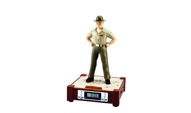 Si alguno alguna vez se pregunto lo que seria despertarse en el ejercito, ahora puede descubrirlo por si mismo gracias al Sargento despertador. Al toque de corneta con la popular “diana” o con los gritos típicos del estilo castrense, no seremos capaces que continuar en la cama. Por falta de valor, principalmente. Su particular aspecto estilo “Chaqueta metálica” con el temible Sargento Hartman al frente de nuestro despertar, hará que hasta el más valiente salte como impulsado por un resorte. Por si acaso.