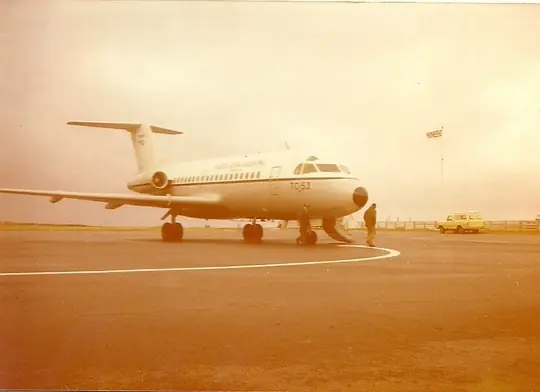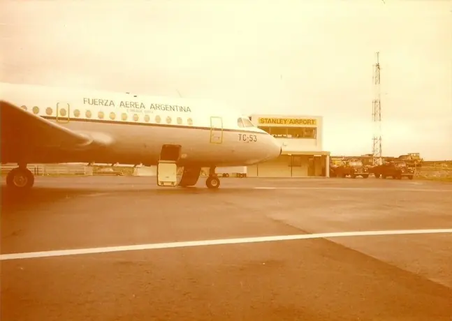 Un Fokker F-28 de la FAA en las islas , al fondo se ve la bandera britanica y una camioneta de LADE