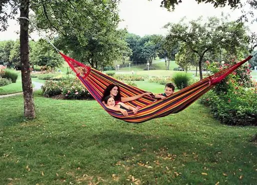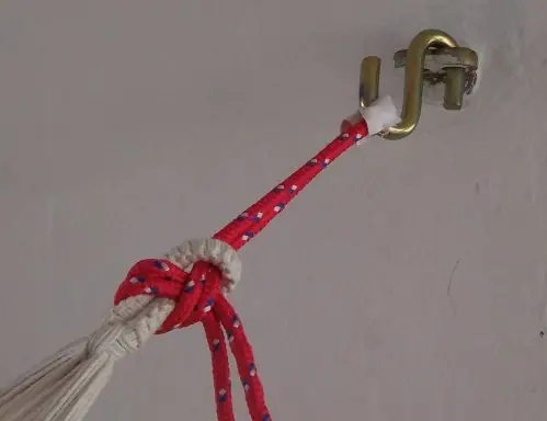 Esta cuerda será la que atemos al árbol o pared, a unos dos metros del suelo, con la ayuda de un mosquetón o un gancho de metal que habremos clavado. El uso de dos cuerdas tiene el objetivo de facilitar la flexibilidad y elasticidad de la hamaca y favorecer así la seguridad de la misma.