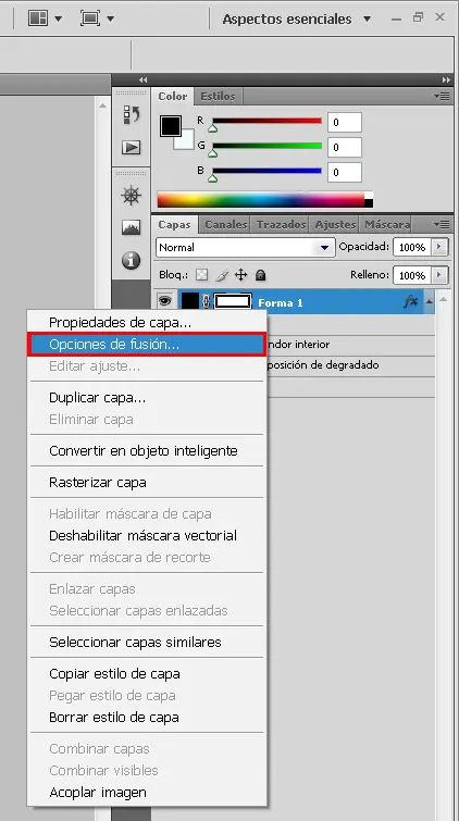 Ahora vamos agregarle efectos a la capa( si ya los tiene predeterminados con la forma, los vamos a editar) hacemos clic derecho en la capa Forma 1 y volvemos a hacer clic en opciones de fusión.