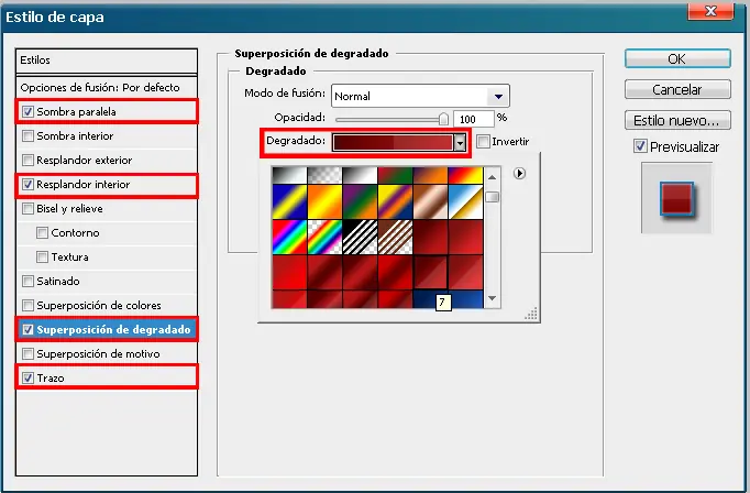 Les voy a mostrar 2 ejemplos para modificar los efectos.. los demas haganlos ustedes: El primero es modificar la SUPERPOSICIÓN DE DEGRADADO. Hacemos clic sobre esta opcion, alli cambiamos el color de degradado que nos guste.