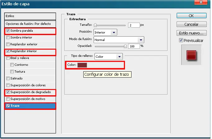 El segundo ejemplo es el TRAZO vamos a hacer clic sobre esta opcion, y vamos a modificar el color del trazo (tamaño: el que te guste).