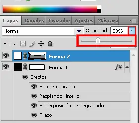 En el mismo lugar donde vemos las capas vamos a seleccionar la forma 2 y donde dice opacidad seleccionamos y la bajamos hasta donde no guste como queda.. yo la deje en 33%