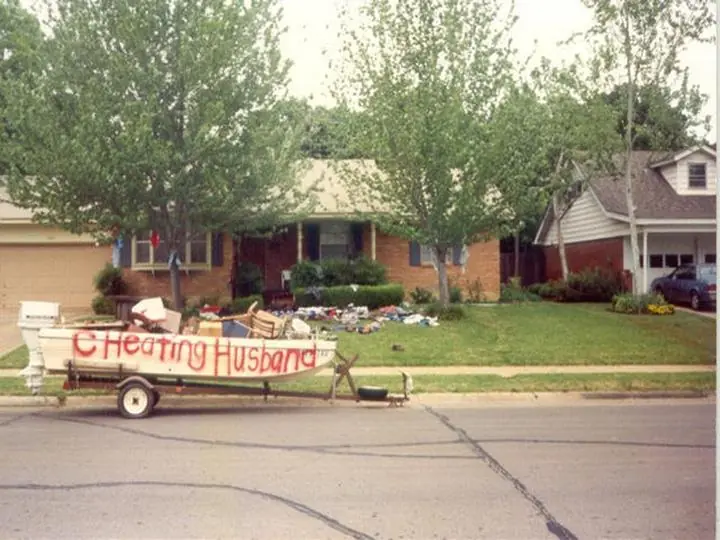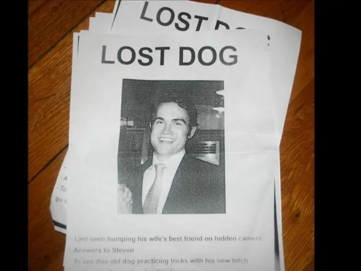 Traducido dice: "Perro perdido. Visto por última vez en cámara montando a la señora de su mejor amigo. Responde al nombre de Steven..."