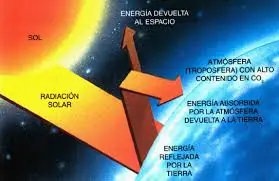 Efecto invernadero, término que se aplica al papel que desempeña la atmósfera en el calentamiento de la superficie terrestre. La atmósfera es prácticamente transparente a la radiación solar de onda corta, absorbida por la superficie de la Tierra. Gran parte de esta radiación se vuelve a emitir hacia el espacio exterior con una longitud de onda correspondiente a los rayos infrarrojos, pero es reflejada de vuelta por gases como el dióxido de carbono, el metano, el óxido nitroso, los clorofluorocarbonos (CFC) y el ozono, presentes en la atmósfera. Este efecto de calentamiento es la base de las teorías relacionadas con el calentamiento global.