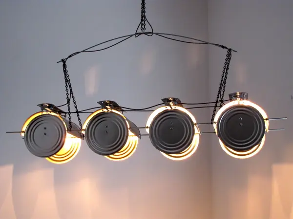 Dale uso a todas las latas, cadenas que no uses, como hacer una lampara parecida a esta.