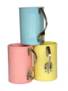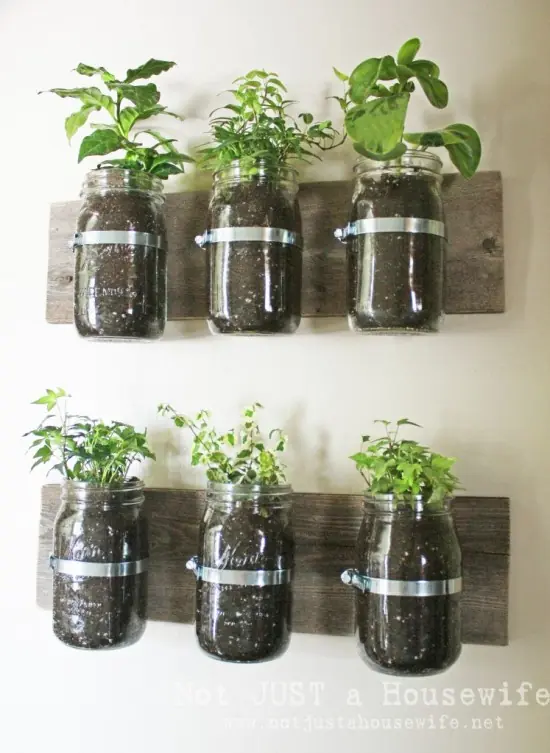 Maceteras con frascos de conserva y tablones de madera que te queden demás.