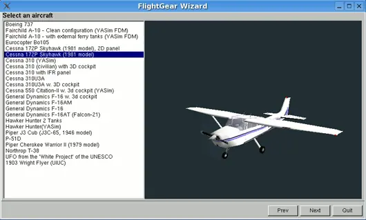 * En Windows, FlightGear empieza permitiéndole escoger un avión y un aeropuerto. Escoja un avión