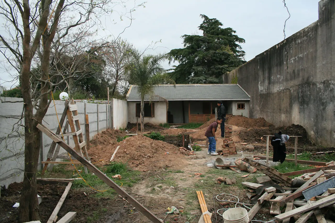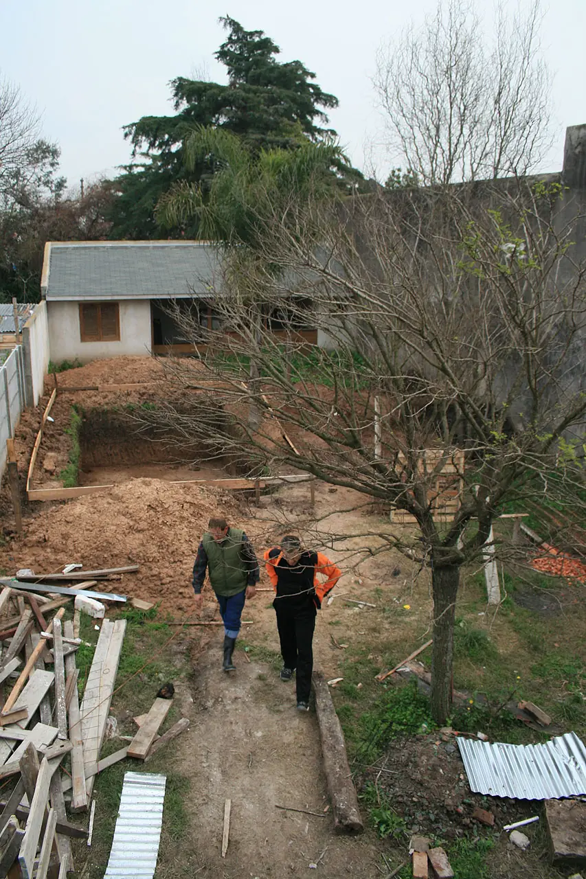 10) Acá están. La palmera al fondo y el sauce adelante sostenidos. No sabíamos si iban a sobrevivir al transplante y a los albañiles. Hierros, palos, piedras, arcilla en el fondo. El que juega con ladrillos es mi hijo.