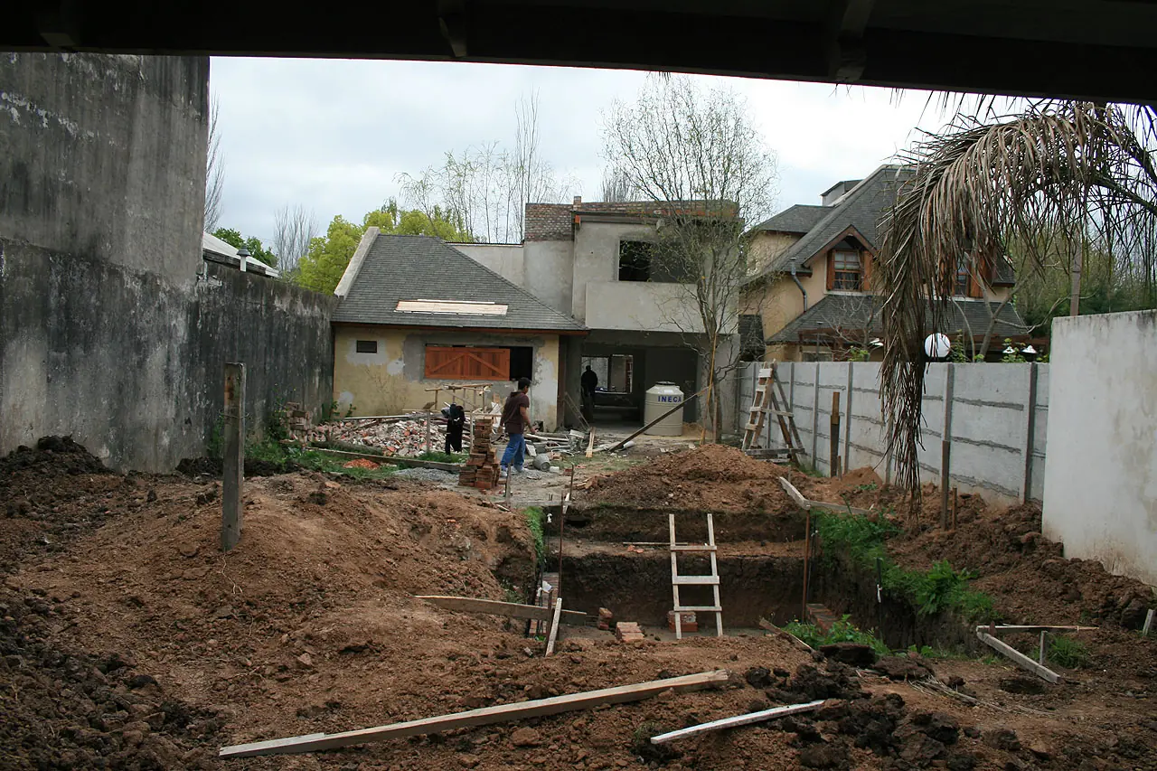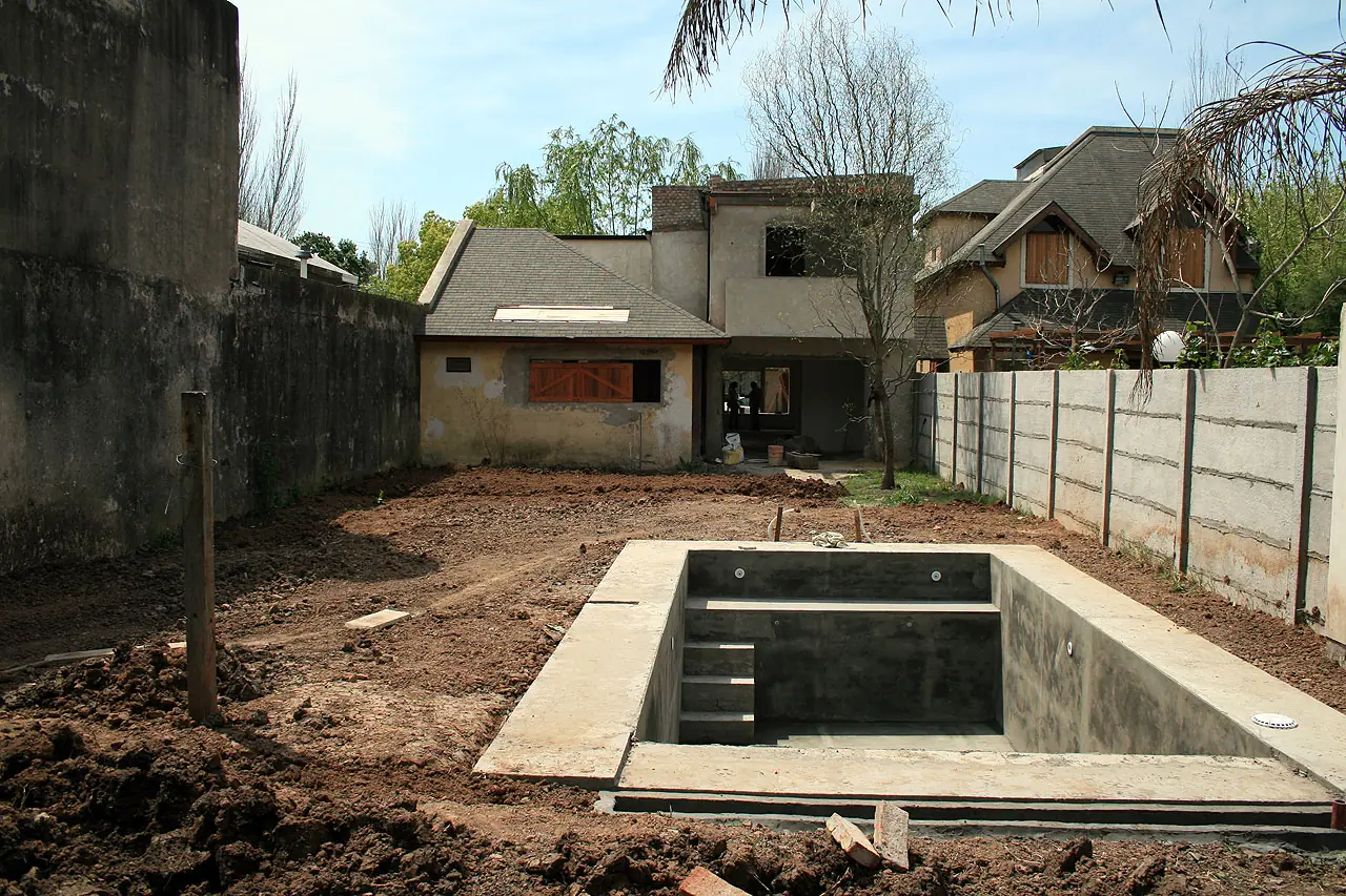 11) Habemus pileta!!. Se comienza a emparejar con lo que hay!. Un asco que traeria consecuencias. Los dos palos con cañitos blancos que se ven en la pileta son los de las luces.