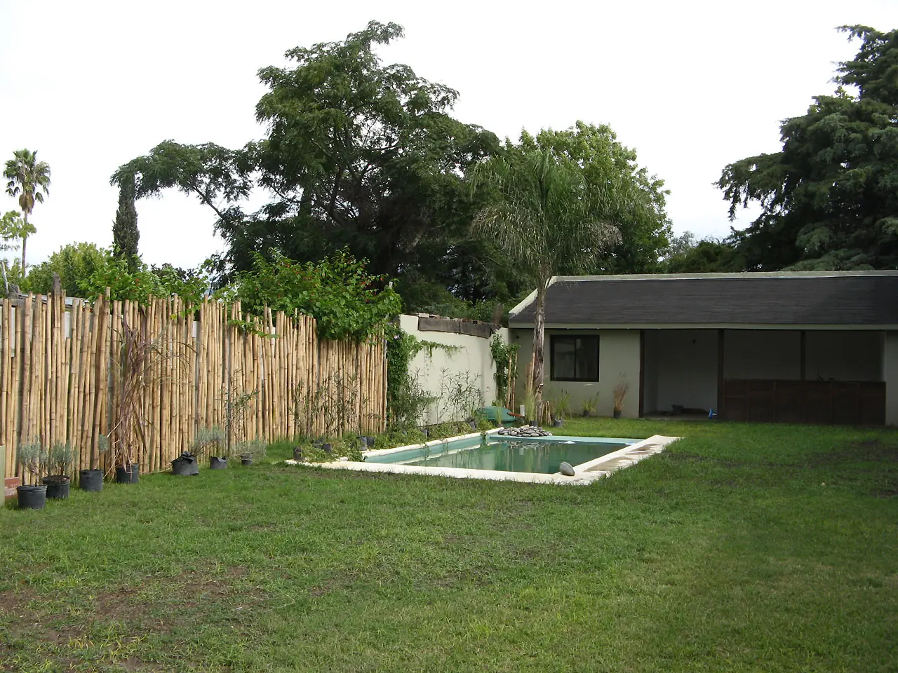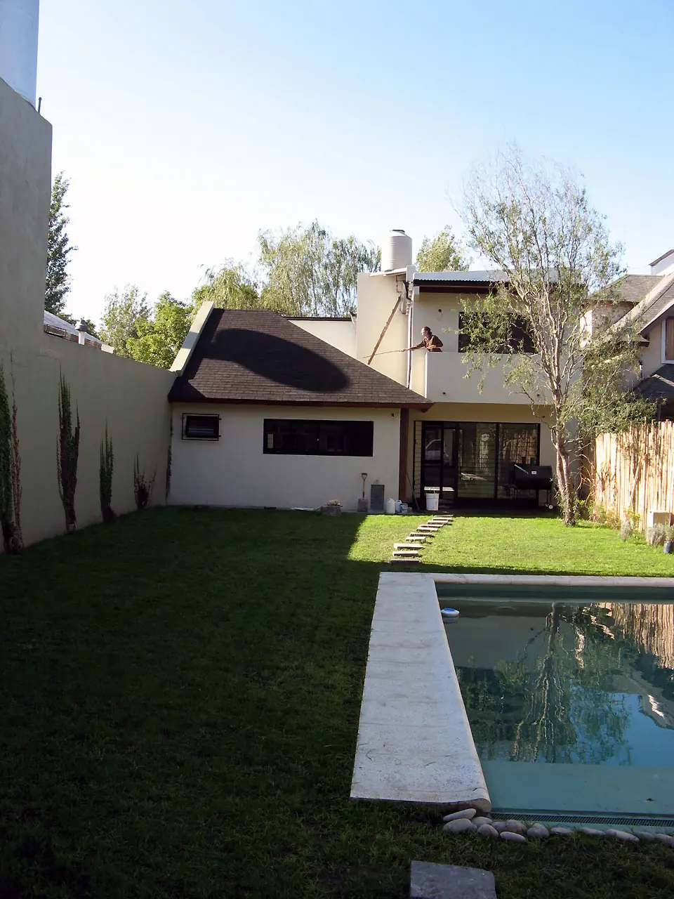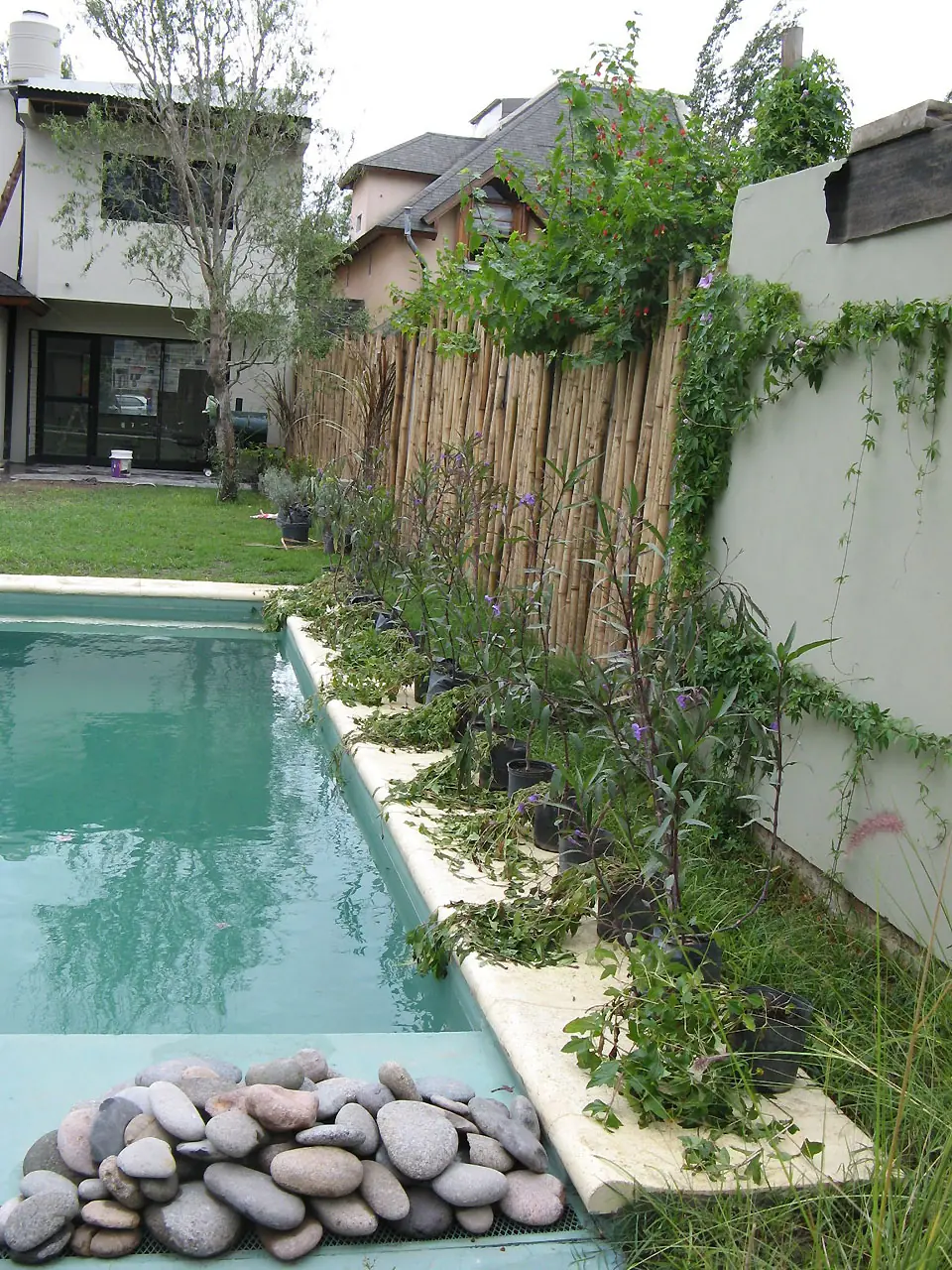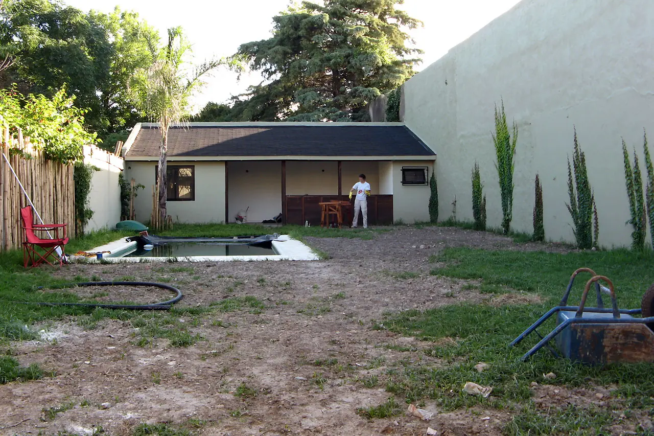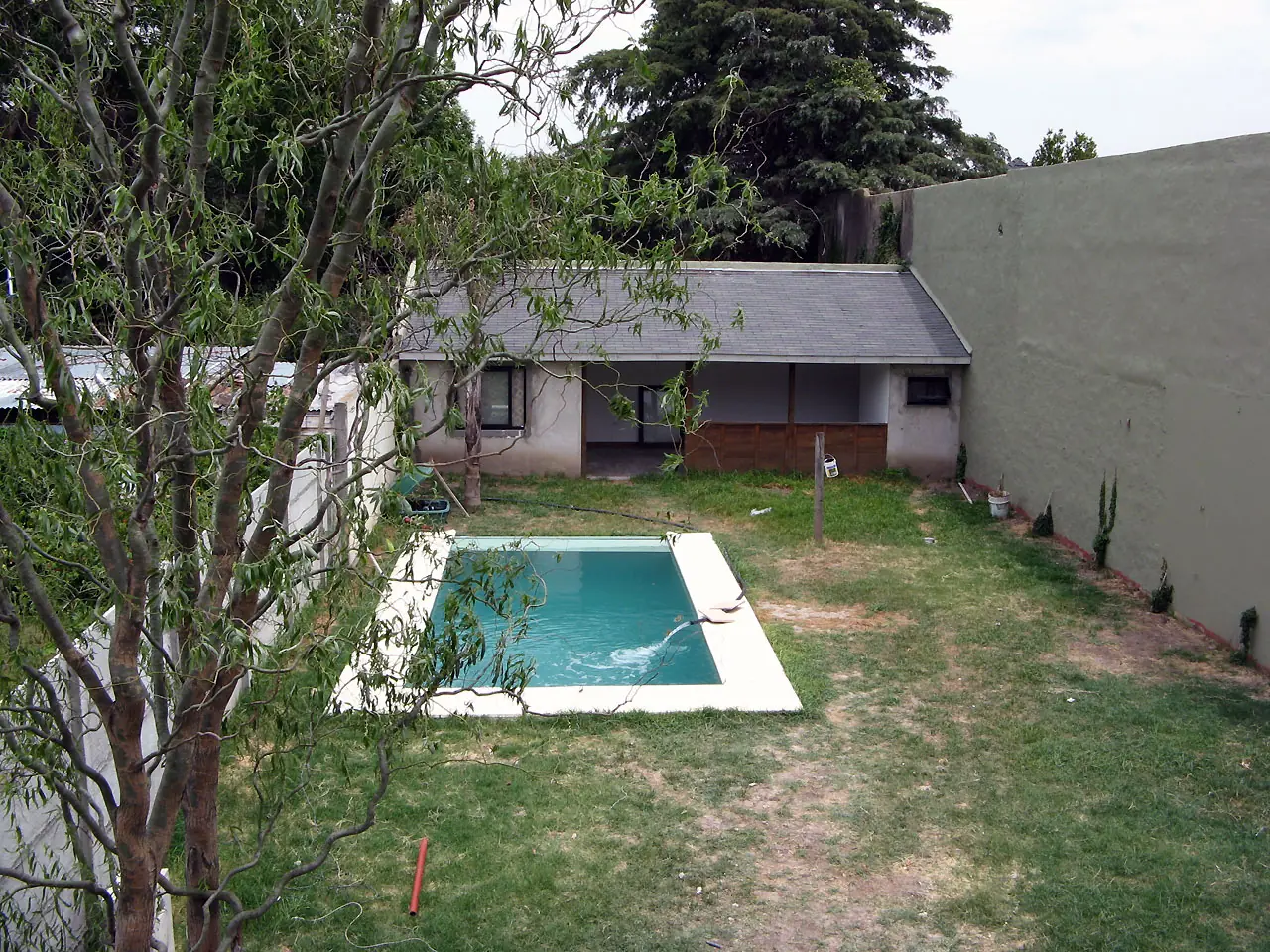 14) Para esta altura las ganas pueden más y se pinta la medianera y plantamos ampelopsis (falsa vid). También se pinta la pileta y se llena así como se puede. El sauce prendió!!. La palmera aun no sabíamos.