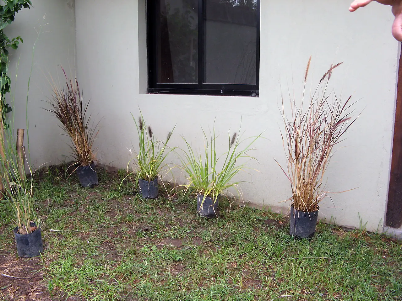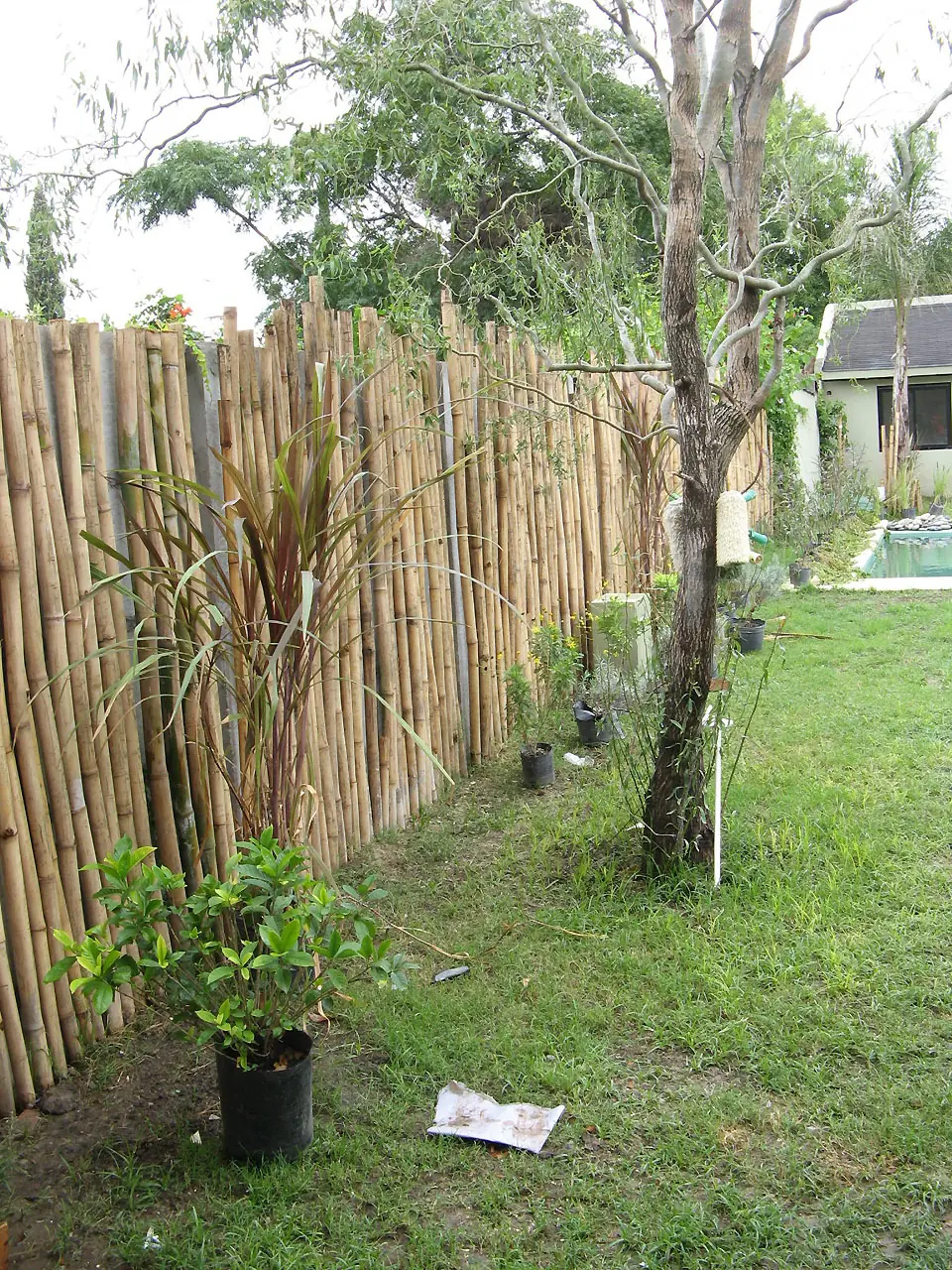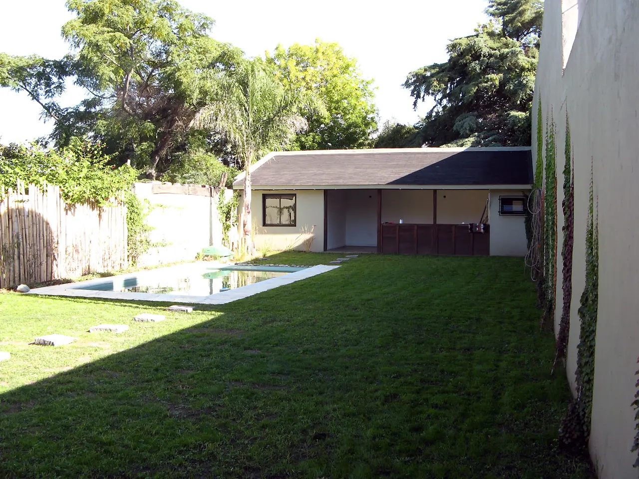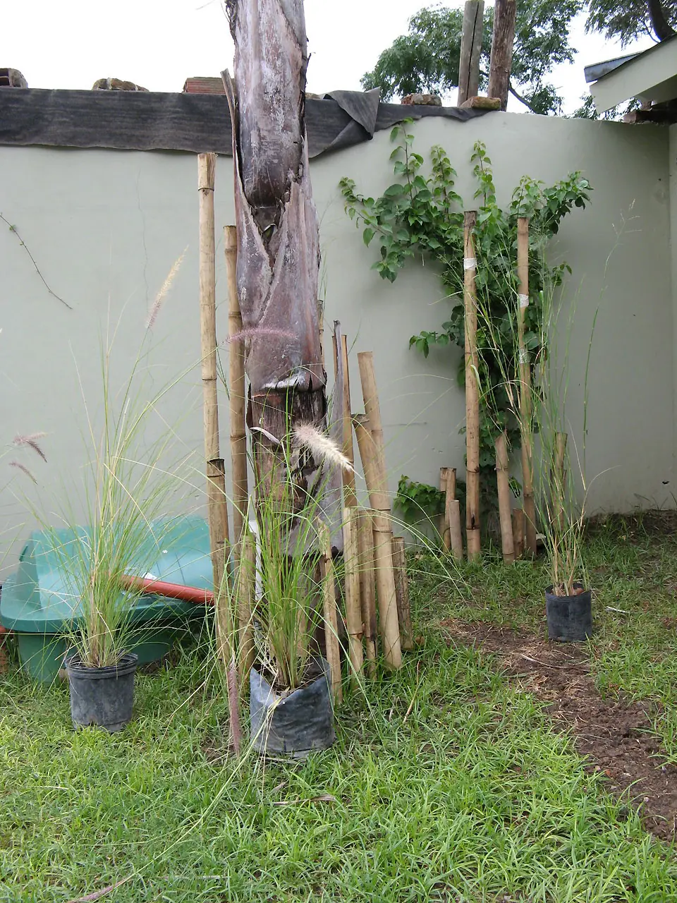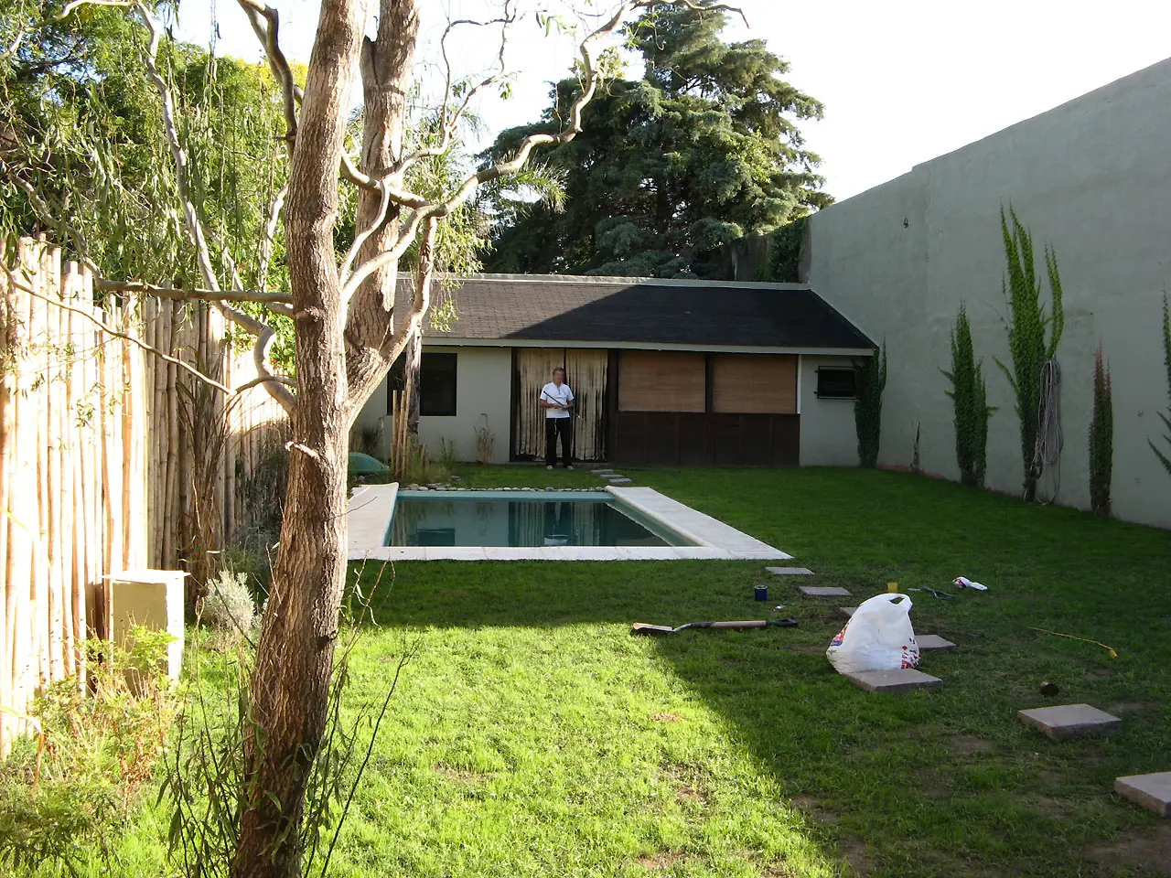 15) Prende la palmera!. Plantamos Santa Rita y pusimos cañas en la pared izquierda. La enredadera avanza a fuerza de riego y fertilizante. La del fondo es mi esposa. El cesped es un vómito.