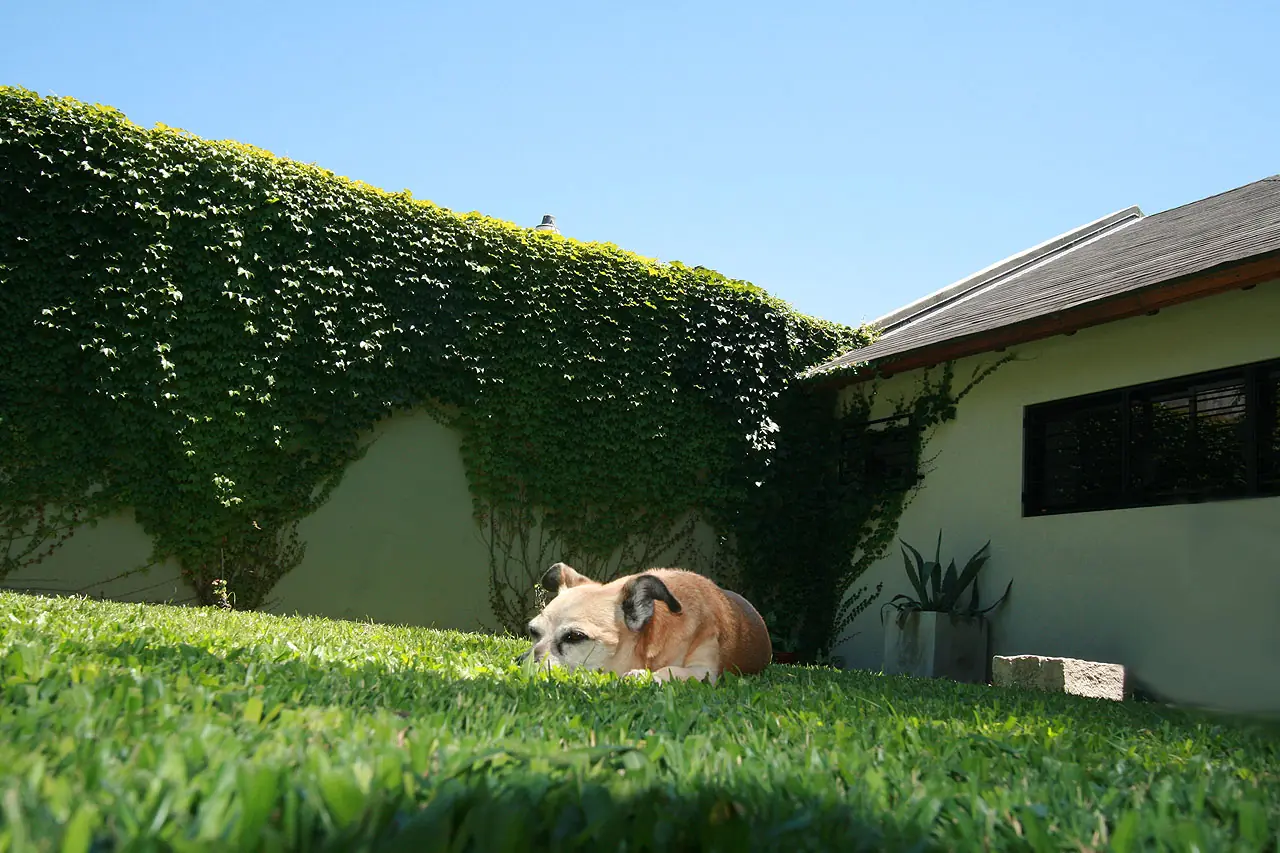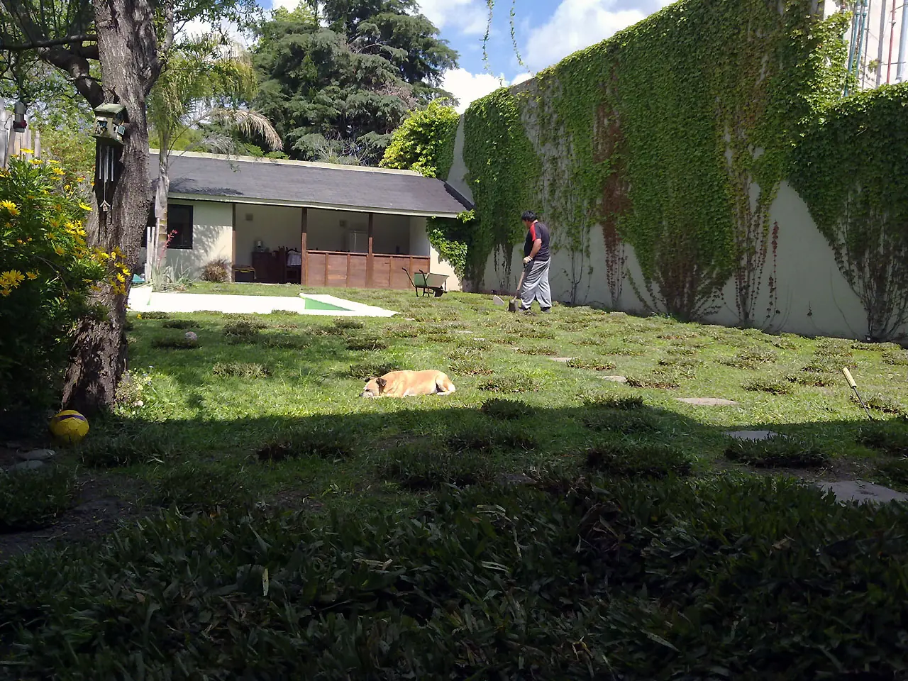 36) Detalle de la parte de adelante con la grama a full, nuestra perra y la ampelopsis al fondo.