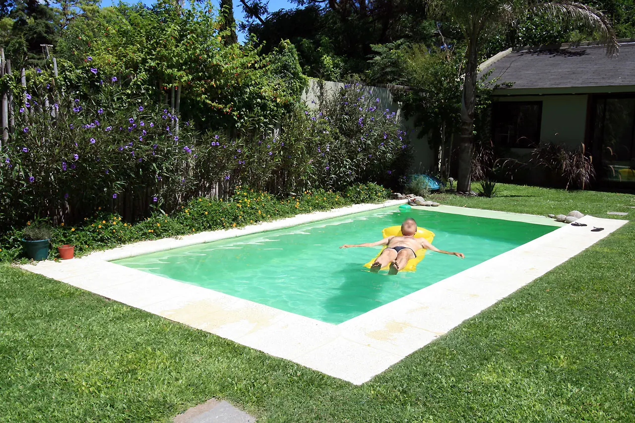 34) Ya esta casi precioso. Limpiando la pileta, la enredadera a full. La grama crece hermosa. Pusimos cerramiento en el quincho. Ambos lados derecho e izquierdo estan más o menos como queríamos.
