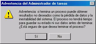 En ella encontraremos muchas aplicaciones no tan necesarias. Te recomiendo terminar el proceso de aquellas que tengan por nombre de usuario uno diferente a "SYSTEM", "SERVICIO LOCAL" o "Servicio de red", ya que estas son vitales para tu PC ya que pueden ser el administrador de dlls, tarjeta gráfica, controladores generales, etc. Para terminar el proceso de una aplicación seleccionamos el proceso que queremos cerrar y hacemos clic en el botón que dice "Terminar Proceso" y nos botara una ventana como la siguiente: