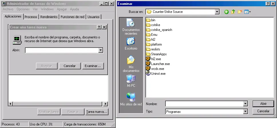 Una vez que hayas cerrado tus aplicaciones nos vamos a la paleta de "Aplicaciones" y hacemos clic en el botón "Tarea nueva..." y nos aparecerá una ventana para examinar el archivo que queramos. Hacemos clic en el botón "Examinar..." y nos aparecerá una ventana en la que buscaremos nuestro archivo ejecutable (exe) de la aplicación que queramos correr. Como dije anteriormente en esta ocasión abriremos el "Counter Strike: Source".