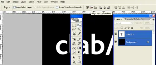 Paso 3:Centramos la capa que contiene el texto con respecto al Background. Para ello seleccionamos la herramienta Mover (Move) [V] y con la tecla ctrl presionada seleccionamos las dos capas. Vamos a la parte superior de la pantalla donde están las opciones de la herramienta y hacemos clic en Alinear centros verticales (Align vertical centers) y Alinear centros horizontales (Align horizontal centers).