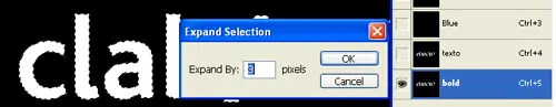 Paso 7:En el canal bold expandimos la selección 3px Selección/Modificar/Expandir(Select/Modify/Expand...) y la rellenamos de color blanco también.