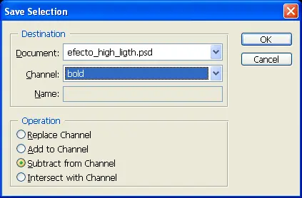 Vamos a Selección/Guardar Selección (Select/Save selection), desplegamos el menú canal (channel) y seleccionamos bold. Vemos que en la parte de abajo aparecen diferentes opciones que son operaciones booleanas.