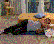 Nos ponemos una almohada en las cervicales , flexionamos las piernas tomando una postura fetal, y colocamos un almohadón entre las rodillas para evitar que una pierna se valla hacia adelante produciendo una rotación en la columna lumbar.