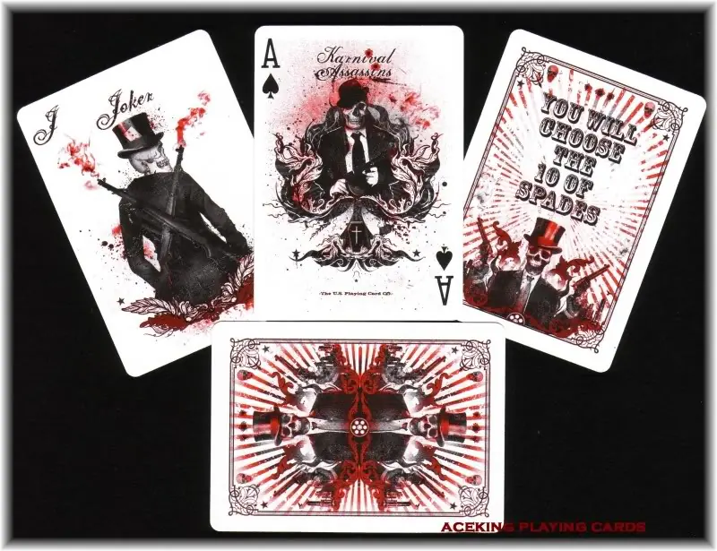 - Karnival Assassin: Gran parecido con las Karnival. Incluye palos rojos en color rojo y un diseño un tanto original de los Jokers y de dorsos.