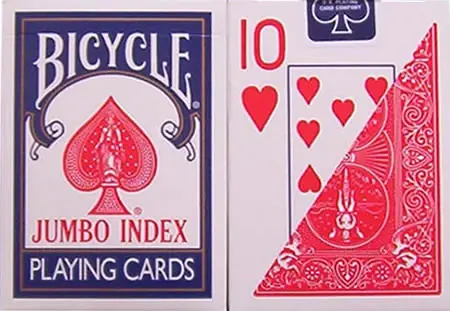 - Jumbo Index: Las cartas de dorso Bicycle presentan el dorso de diseño general utilizado por todos los casinos del mundo y los índices gigantes hacen que sea fácil para el público verlos a distancia.