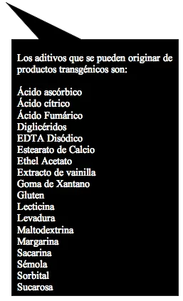 Los aditivos son sustancias obtenidas de OGM que se emplean para otros alimentos. Éstos los podemos leer a diario en las etiquetas de los productos que consumimos.