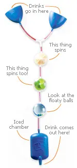 Multi Mezclador de bebidas, tiene 2 Embudos, dos mezcladores, una bola transparente donde ves tu mezcla y por ultimo una bolsa de hielo que es la ultima instancia para enfriar la bebidas antes de ir al vaso