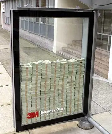 Una buena forma de hacer publicidad.. para promocionar este vidrio le pusieron plata adentro y lo monitoreaban, nadie lo pudo romper! Exelente Publicidada! 150.000 dolares habian!