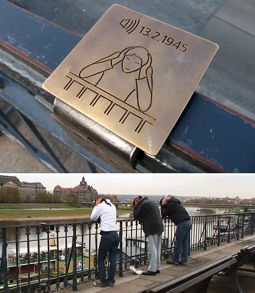 Es un chip colocado en una baranda y si te pones en la pose que se ve en la foto sobre este chip, podes escuchar los sonidos de los ataques que se produjeron el 13 de Febrero de 1945 en la ciudad que te encuentres.