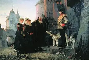 Un cuadro historicista en el que se muestra, en tono melodramático, a un pobre anciano entregando sus jóvenes hijas al despótico señor feudal