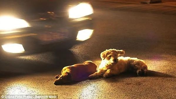 Esto sucedió en la concurrida avenida Dazhi en China, donde un perro fue atropellado por un automóvil y otro perro arriesga su propia vida para cuidar de su amigo herido.