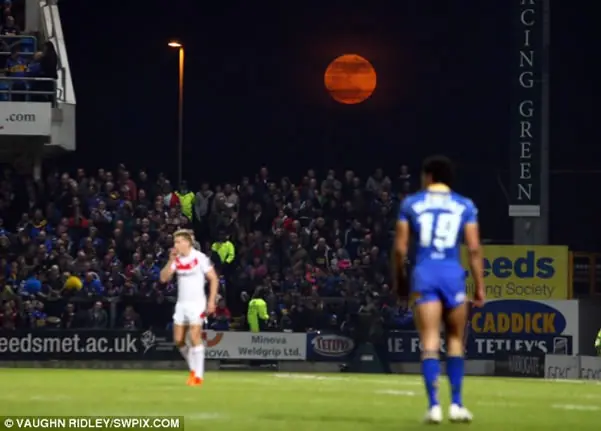 Un partido de rugby en Headingley, se ve la luna bañada en un resplandor naranja