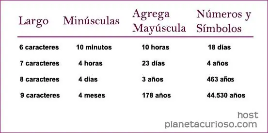 Ahora bien, si no utilizas una de esas, deberías preocuparte por tener una más segura, quienes su clave se compone de números consecutivos o de su primer nombre ya es tiempo de cambiarla. Y si no checate la tabla para que veas cuánto se tardaría un hacker en averiguar tu contraseña.
